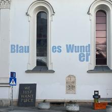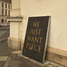 "Wladimir Putins Russland führt seinen blutigen Angriffskrieg, während es vorgibt, sich für Frieden einzusetzen," schreibt Ekaterina Degot, in Moskau geborene Intendantin des „steirischen herbst“, über das Festivals 2025 mit dem Motto "Never Again Peace", das ein Stück von Ernst Toller aus der Zwischenkriegszeit zitiert. Der aus dem ostukrainischen Charkiv stammende Illya Pavlov bringt es mit seiner für die Hauptausstellung des Festivals entstandenen Arbeit "Piece" auf den Punkt: Beim Satz in Goldlettern wie auf einem Grabdenkmal stolpert man beim scheinbar falsch geschriebenen Wort hinter dem vergoldeten Ölzweig in die traurige Realität eines hohl gewordenen Begriffes und die Wut seiner ukrainischen Landsleute. Denn gleichzeitig scheint sarkastisch die Frage anzuklingen, wie groß das Stück des überfallenen Landes sein müsste, um es in Frieden zu lassen, wenn man es bekommt. Nach Ausstellungsende in der für den „steirischen herbst“ genutzten ehemaligen Destillerie Bauer in der benachbarten Prankergasse wurde das Werk temporär an einer Außenwand der St. Andräkirche an einer Kreuzung im multikulturellen Griesviertel installiert.